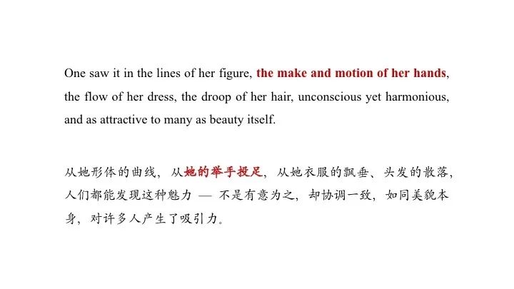 首先是“主次分明的節(jié)奏韻律”。大家可以再去讀上面Little Women的選段,關注其中長短句與描寫詳細程度的安排。你會發(fā)現(xiàn)大多數(shù)段落長短句都是交替出現(xiàn)的,非常具有韻律感,其中長句多是突出關鍵特征,而短句則是將其他特征一帶而過,讀者即能有總體印象,也能關注到重點。
