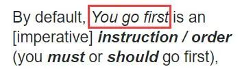 一般情況下,You go first是一種權(quán)威性的指示或命令,表示“你必須先走”、“你應(yīng)該先走”