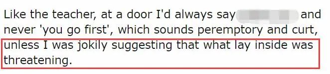 正如老師說的,進(jìn)出門時(shí)我只會(huì)說XX(見下文嘻嘻),絕不會(huì)說You go first,因?yàn)樗犉饋硎菑?qiáng)制性的。除非我是在開玩笑地暗示“里面有危險(xiǎn)”(就像咱們搞小陰謀時(shí)會(huì)慫恿別人“你先你先”)