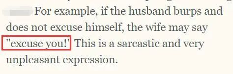 當老公打了個嗝,卻沒有請求原諒他(也就是沒有說“Excuse me”),老婆就可以說“Excuse you”。這是個諷刺和不友好的表達。
