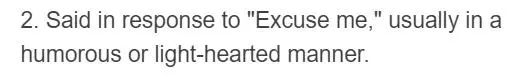 用作對 Excuse me 的回應,通常是一種開玩笑或者輕松的態度。