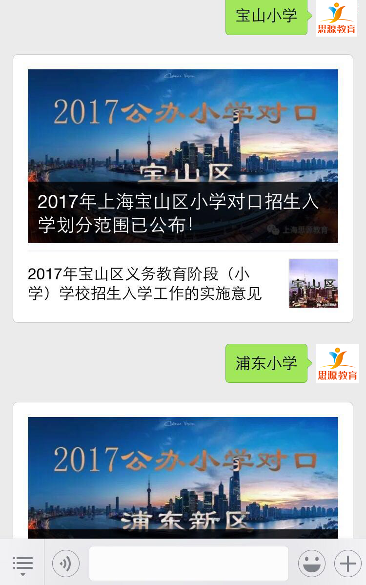 例如:如果你在寶山區,那么當你需要查看幼升小相關信息時,直接在對話框中回復“寶山小學”四個字即可。