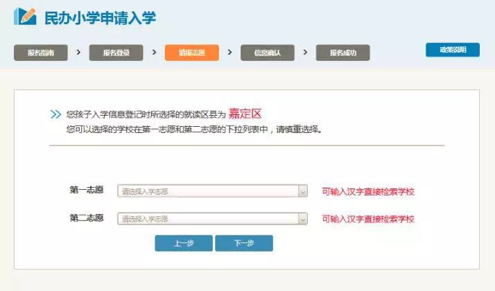 首先請確認就讀區縣(入學信息登記時所選),然后請在下拉列表中慎重選擇志愿學校。