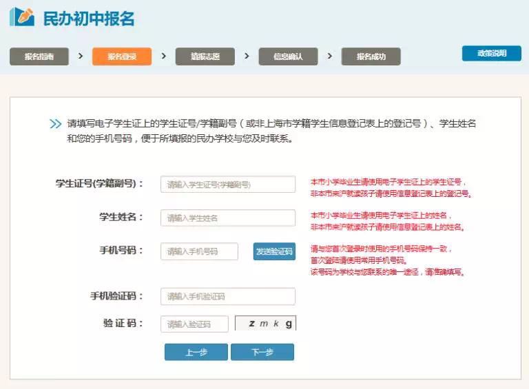 在該步驟,需填寫學生證號(本市小學畢業生請使用電子學生證上的學生證號,非本市來滬就讀孩子請使用信息登記表上的登記號)、 學生姓名(本市小學畢業生請使用電子學生證上的姓名,非本市來滬就讀孩子請使用信息登記表上的姓名) 和手機號碼(請與您首次登錄時使用的手機號碼保持一致,首次登錄請使用常用手機號碼。該號碼為學校與您聯系的唯一途徑,請準確填寫)。