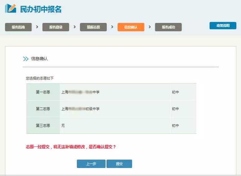 請確認是否是您在上一步中所選志愿學校,志愿一經提交無法修改,請慎重提交。