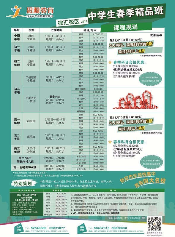 各大校區:思源教育(浦東中學生)、思源教育(徐匯少兒)、思源教育(徐匯中學生)、思源教育(徐匯三校生高復)、思源教育(浦東三校生高復)、思源教育(浦東上南)、思源教育(閔行龍柏)、思源教育(寶山大華)、思源教育(楊浦大橋)、思源教育(浦東金橋)、思源教育(浦東八佰伴)、思源教育(黃浦一部)、思源教育(黃浦二部)