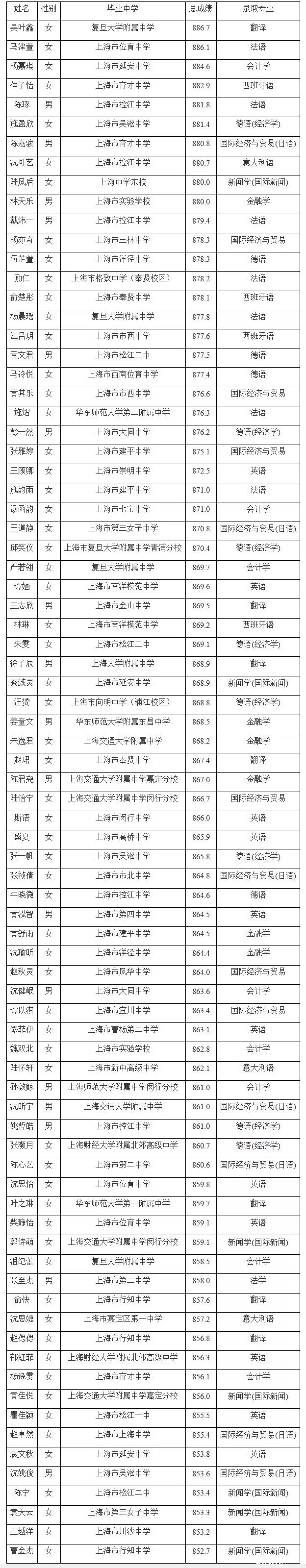 我校根據教育部及上海市有關文件要求,按照《上海外國語大學2018年上海市綜合評價錄取改革試點招生簡章》的規定,以高考成績、校測成績、高中學業水平考試折算成績按6:3:1的比例計算綜合評價總成績,擇優選拔錄取,經學校招生工作領導小組審議,確定了綜合評價錄取名單,錄取分數線為852.7分,并報上海市教育考試院核準。