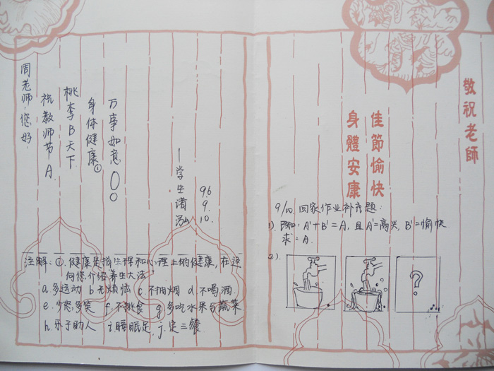 這是一張她從小攤上用3角錢買來的教師節專用賀卡,右半頁印著三行豎排的紅字,“敬祝老師:佳節快樂、身體安康”。小諸同學在左半頁上方豎著寫了五行字,分別是“周老師你好”“祝教師節A”“ 桃李B天下”“身體健康①”“萬事如意!”最后是署名及日期96.9.10在這四行字下面,對“健康”做了注解:健康是指生理和心理的健康。在這里向你介紹養生大法:a.多運動,b.無煩惱,c.不抽煙,d.不喝酒,e.少怒多笑,f.不挑食,g.多吃水果蔬菜,h.樂于助人,i.睡眠足,j.定三餐。