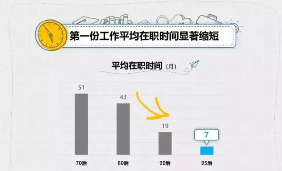 近日,一份關于95后工作狀況的報告引起了社會各界的關注。數據顯示,職場人第一份工作的平均在職時間呈現出隨代際顯著遞減的趨勢。70后的第一份工作平均超過4年才換,80后則是3年半,而90后驟減到19個月,95后更是僅僅在職7個月就選擇了辭職。超過7成的95后畢業生第一份工作與所學專業無關。