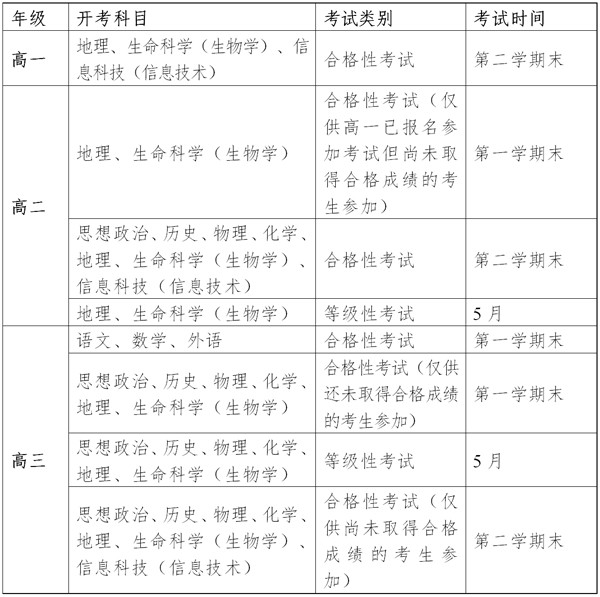 高中學(xué)業(yè)水平考試包括合格性考試和等級性考試兩類。語文、數(shù)學(xué)、外語、信息科技(信息技術(shù))、體育與健身(體育與健康)、勞動技術(shù)(通用技術(shù))和藝術(shù)(音樂、美術(shù))科目只設(shè)合格性考試,思想政治、歷史、地理、物理、化學(xué)、生命科學(xué)(生物學(xué))科目分設(shè)合格性考試和等級性考試。