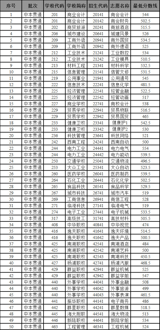 2018年上海市中等職業學校提前批招生中本貫通、中高職貫通各專業錄取最低分數線。