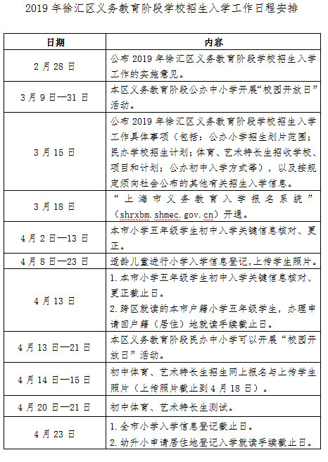 2.4月8日—4月23日,凡本區在園適齡兒童家長在就讀幼兒園登記孩子入學信息,未入園適齡兒童家長可在規定時間至徐匯區教育局招生考試中心(百色支路28號)登記孩子入學信息,獲取小學入學信息登記表和入學報名告知書;4月23日為本市小學入學信息登記截止日,之后不得更改入學信息。