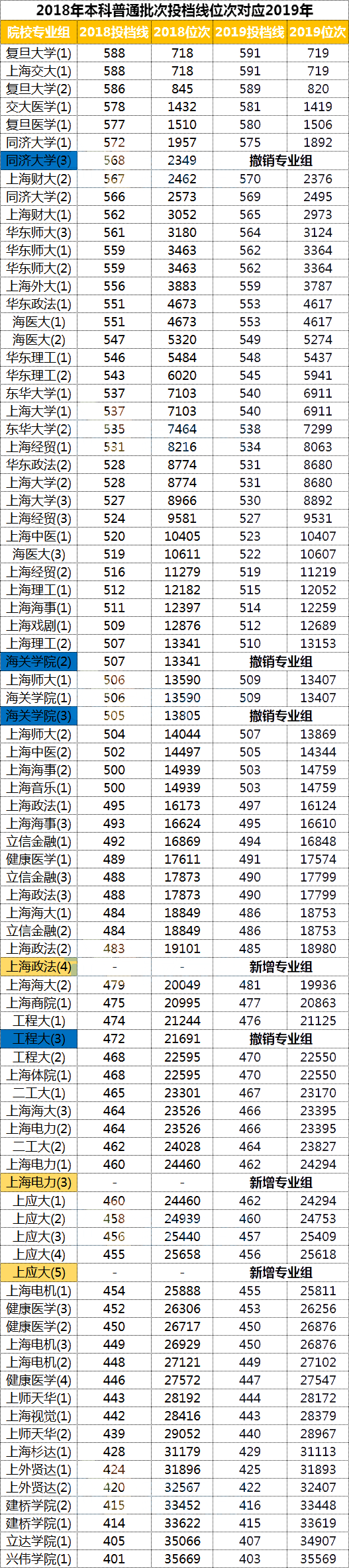 表格根據[2018年上海高考成績分布表]中對應的位次換算成了2019年的數據;可作為普通批志愿填報的參考依據。部分學校按照今年的形勢還會小幅度上漲。2019年上海本科院校中新增了部分專業組,所以沒有參考數據,本數據也只是建立在2018年的排位上進行推算,僅供大家參考!