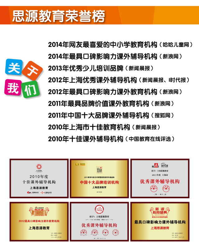 思源教育(原上海交大思源進修學院,簡稱思源教育)成立于1996年,自建校以來,秉承交大校訓,依托名校師資,提供專業的托班輔導、青少年英語輔導、小學輔導、初中輔導、高中輔導、高考高復、三校生高復、藝考生文化課等,學生遍及全市各區,至今已幫助六萬多余名學子取得優異成績,成功考入理想的各級院校!20余年來思源已成為“中考教學研究中心”、“中學個性化學習教育基地”、“快速學習法”實驗學校。