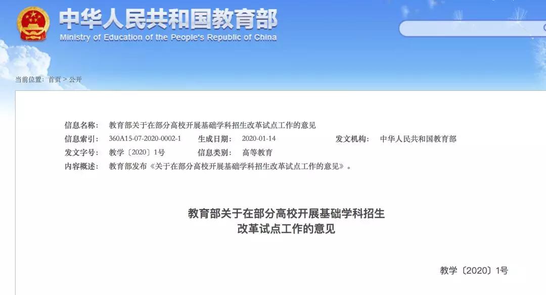 為深入貫徹黨的十九大和十九屆二中、三中、四中全會精神,落實全國教育大會精神,服務國家重大戰略需求,加強拔尖創新人才選拔培養,我部決定自2020年起,在部分高校開展基礎學科招生改革試點(也稱強基計劃)。現就有關工作提出如下意見。