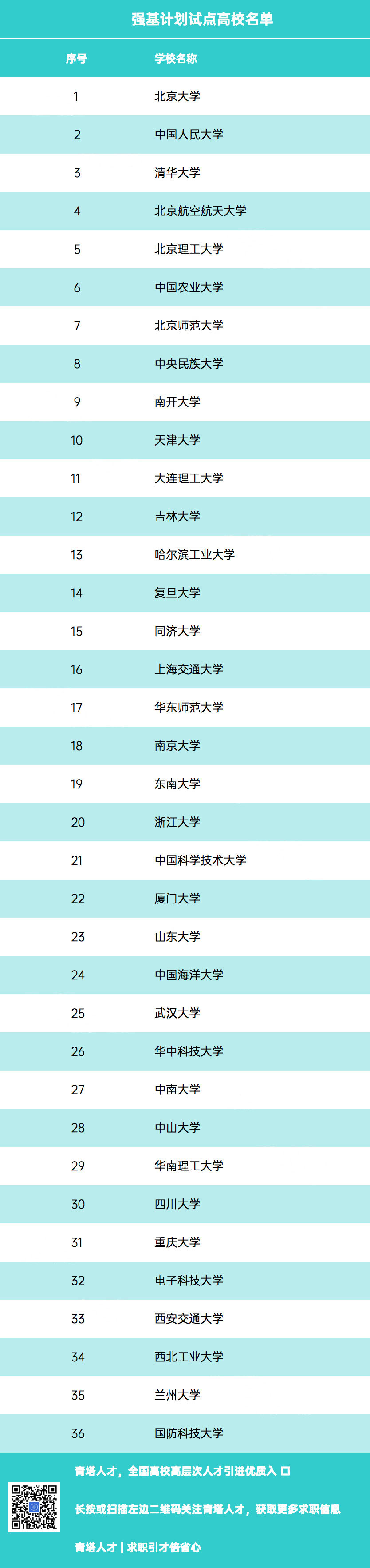 文件明確,起步階段,在部分“一流大學”建設高校(見附件1)范圍內遴選高校開展試點。相關高校可向我部申請并提交相關專業的招生和人才培養一體化方案。我部組織專家綜合考慮高校的辦學定位、人才培養質量、科研項目及平臺建設情況、招生和人才培養方案等因素,按照“一校一策”的原則,研究確定強基計劃招生高校、專業和規模。2020年起,不再組織開展高校自主招生工作。