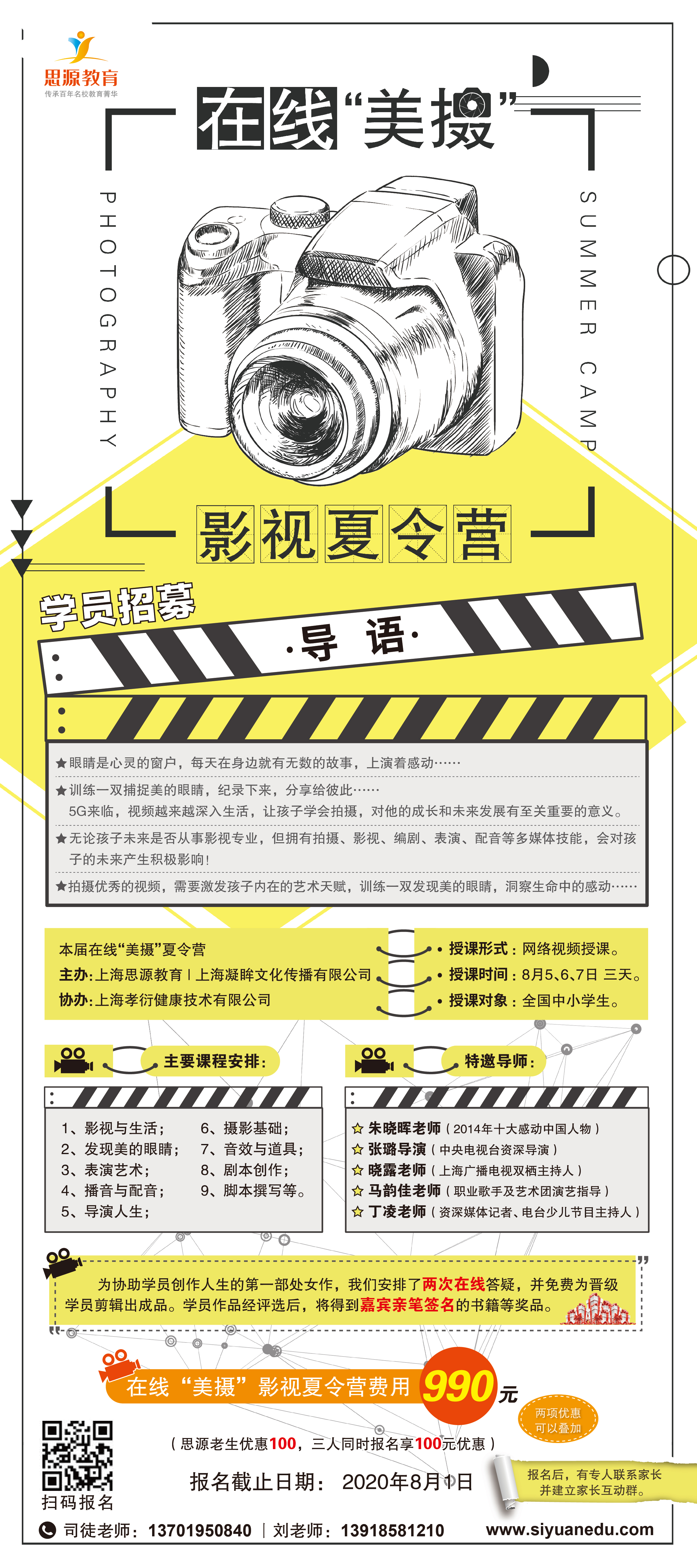 在線“美攝”影視夏令營費用990元,(思源的老生就優惠100,三人同時報名享100元優惠,兩項優惠可以疊加)
