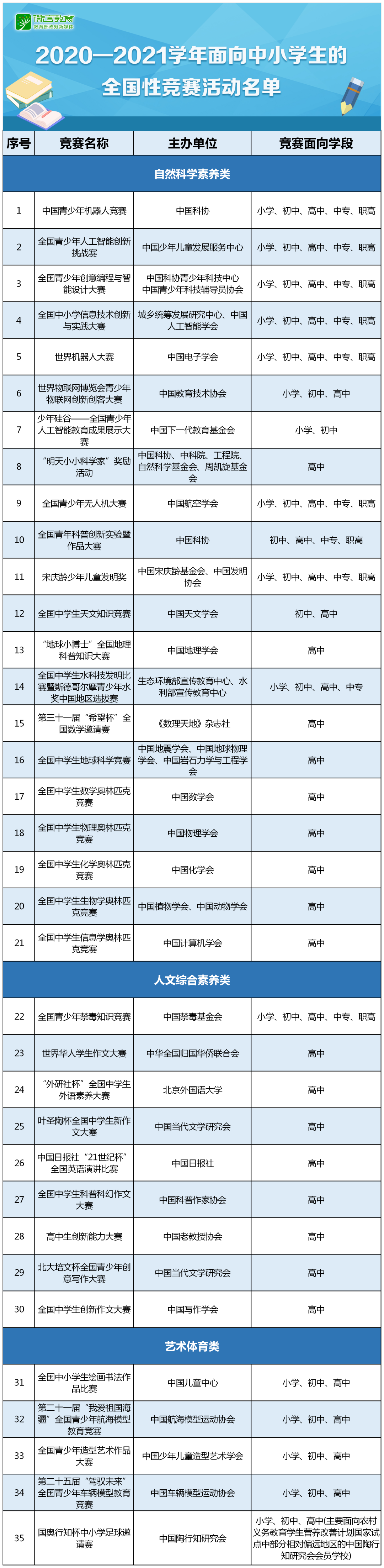 日前,教育部公布了2020-2021學年面向中小學生的全國性競賽活動名單,名單分為“自然科學素養類”“人文綜合素養類”“藝術體育類”三類,共有“中國青少年機器人競賽”等35項競賽進入名單。