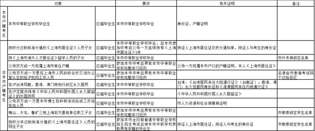 注:春季考試報名考生不含本市中等職業學校(含中專、職校和技校)的應屆畢業生;18至24周歲男性公民須經查驗兵役證(符合報名條件的外國僑民、在滬臺胞、香港及澳門特別行政區永久居民身份除外);各類證件須在有效期內。