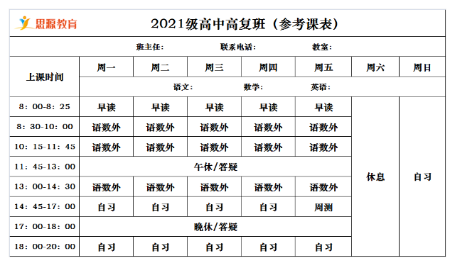 為確保教學質量及學生學習效果,本著時間最大化利用的原則,針對高中高復班的學生采用每周六天的學習計劃,其中周一至周五為常規學習日,周日為學生自主自習日,周六統一休息。學習日原則上安排每日12小時的學習時間,其中有早讀、常規授課、答疑、班會、自習及周測;另安排階段性測試,如月考、模擬考、期中及期末考等,如下可供參考: