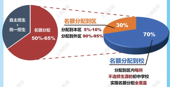 名額分配分為兩部分,其中70%分配到不選擇生源的每所初中學校,剩下30%分配到區。換算一下,名額分配給不選擇生源的每所初中學校大約占市重點高中總招生計劃的35%—45.5%;名額分配到區大約占市重點高中總招生計劃的15%—19.5%。