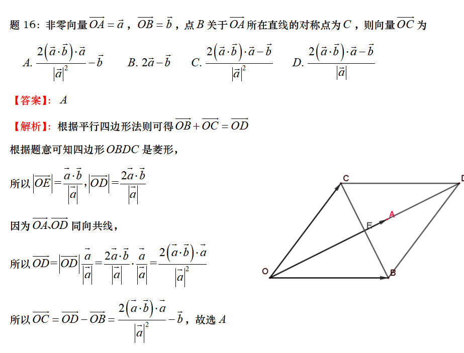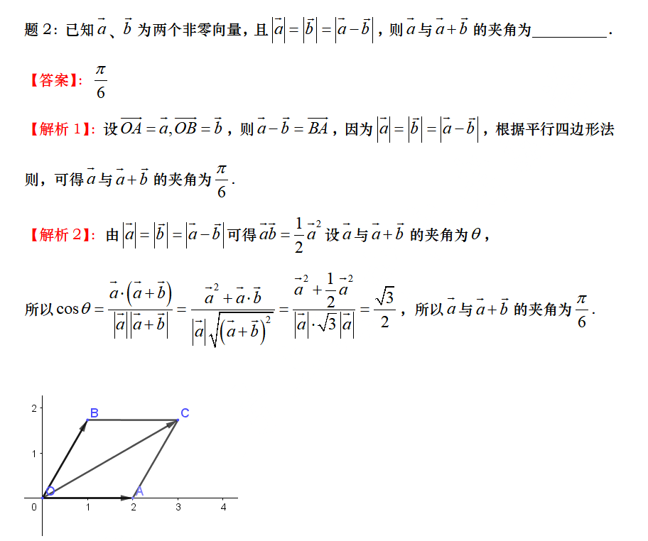 題2有的同學采用數量積的方法,最容易想到,但計算量略大,而解法1通過向量三角形法則和平行四邊形法則更容易得出結果。所以多觀察所給條件,再利用所給條件解題。