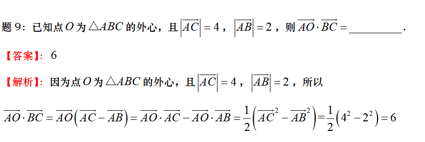 題9利用涉及外心的一個常用結論,同時我上課告訴學生涉及向量的數量積如果無法直接求出,就把其中的一個或者兩個向量進行轉化和分解,向題目提供的條件這個方向進行分解和轉化。