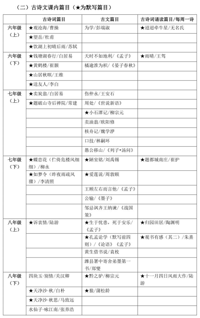 古文篇 刪除 生于憂患,死于安樂/《孟子》、孔孟論學(默寫前四則)/《論語》《孟子》、黃生借書說/袁枚、濰縣署中舍弟墨第一書/鄭燮,增加 答謝中書書/陶弘景、記承天寺夜游/蘇軾、《愚公移山》/《列子·湯問》。