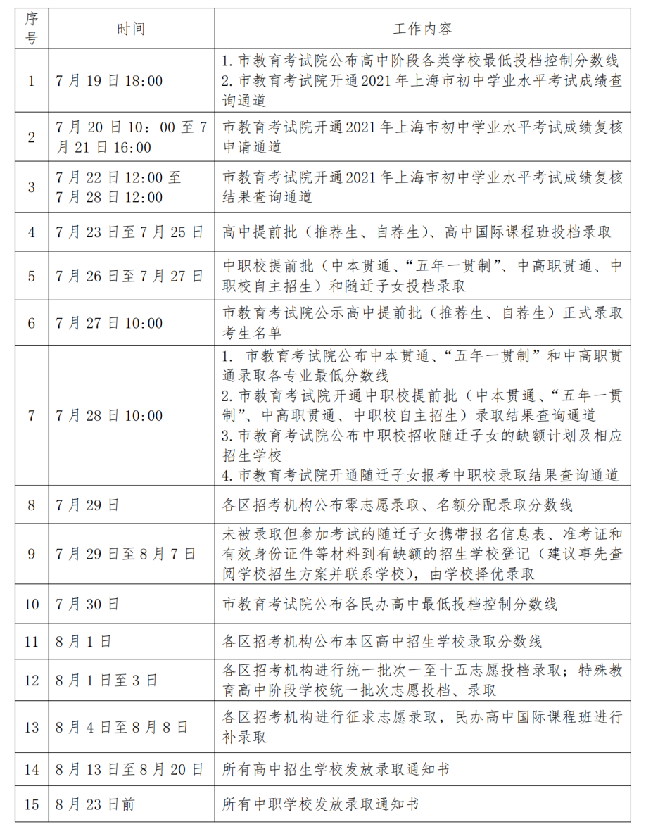 2021年上海市高中階段學(xué)校招生錄取工作日程
