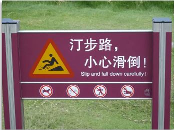 其實細琢磨起來,還真沒毛病。比如這個標語吧,在“滑”和“倒”的時候,是該小心一點呢!