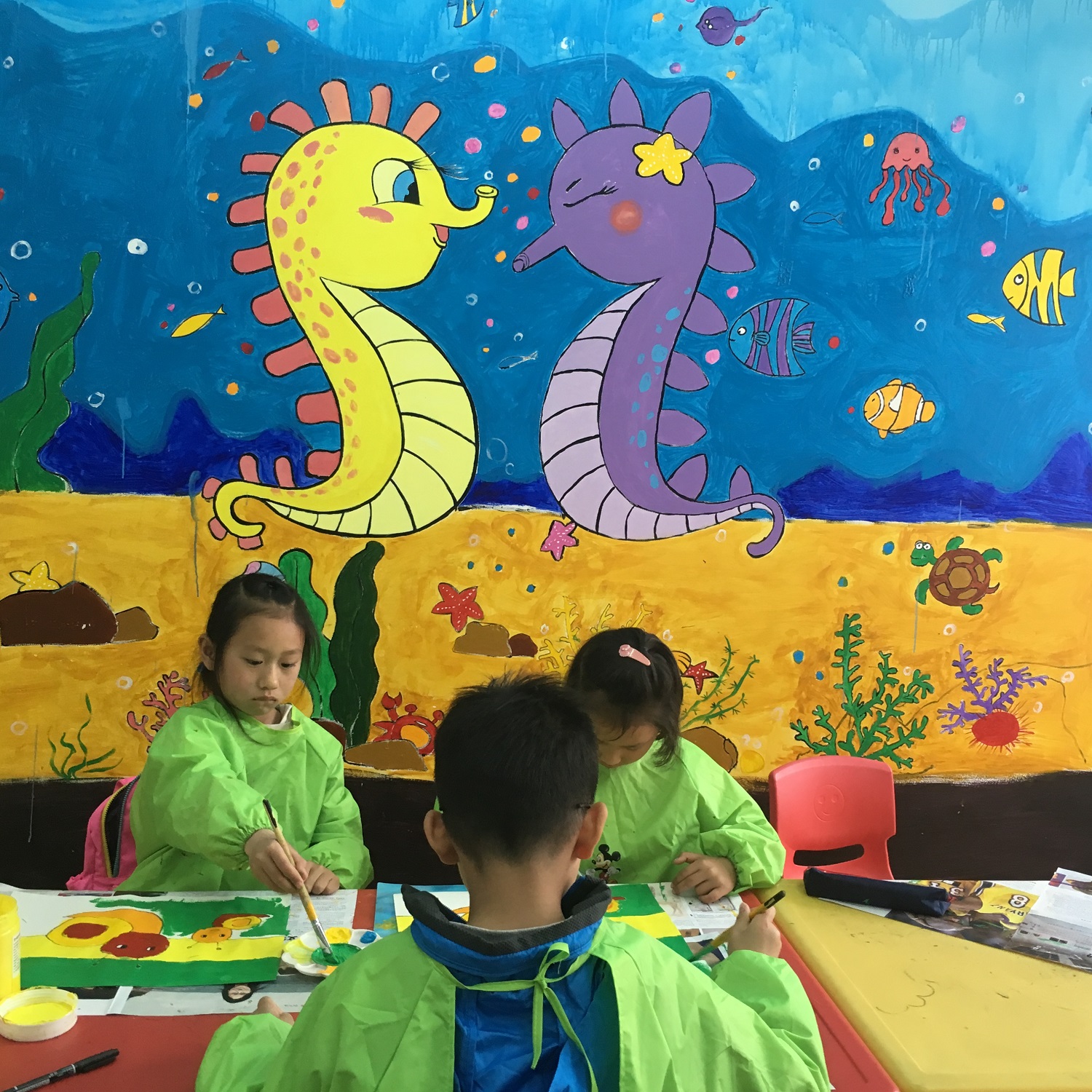 最引人注目的,當屬專門供畫畫用的美術室了。當你跨進教室的時候,黑板上兩只萌貓一下子把你拉到久違的童年。那黑黝黝的葡萄似的大眼睛,俏皮的長尾巴,讓我想起小時候家里養過的大肥貓啦。小孩看到這幅畫,會忍不住要上去撫摸一下它的長尾巴吧。