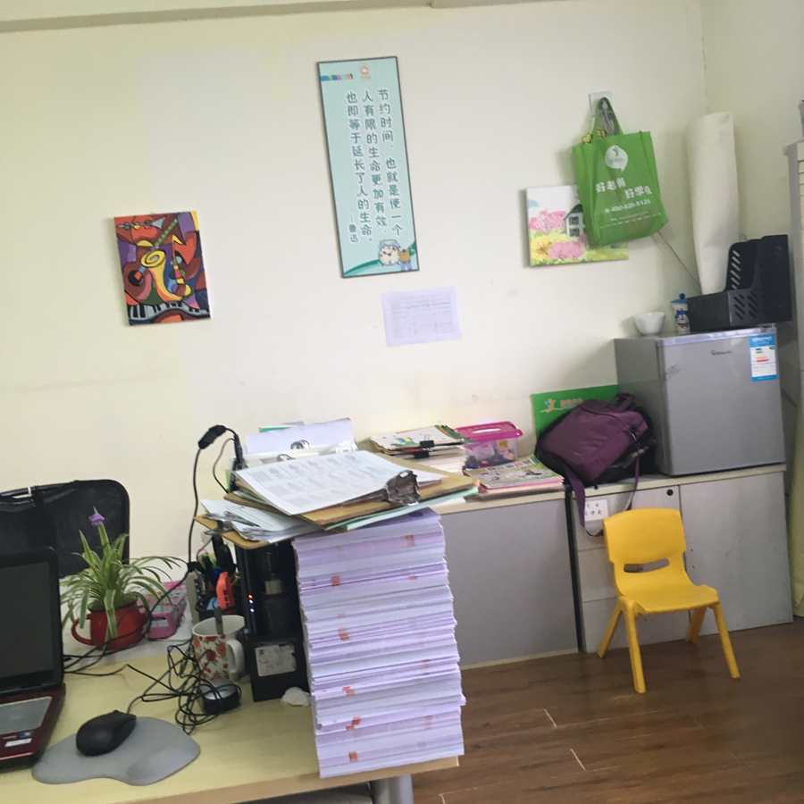 這個校區有十幾個老師,今天是周末,老師都在上課,所以辦公室就顯得空蕩蕩的。桌上堆滿了輔導資料,連墻角都是。有個老師正在看資料。看她時而微笑、時而皺眉,就知道有多專注啦。