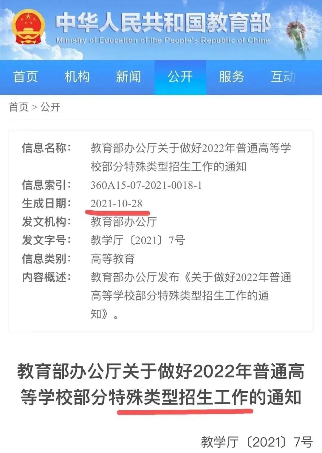 近日,教育部對外公開《關于做好2022年普通高等學校部分特殊類型招生工作的通知》。
