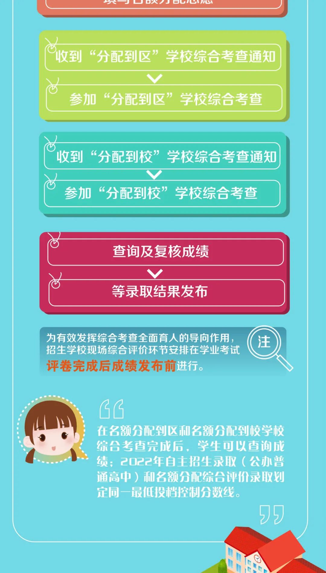 《中招若干意見》與《綜合考查指導(dǎo)意見》全文可登錄“上海教育”網(wǎng)(edu.sh.gov.cn)和“上海教育”政務(wù)微信(SHMEC-xwb)查閱。此外,本市各初中學(xué)校也將召開相關(guān)年級家長會,集中宣講解讀2022年中招相關(guān)政策。