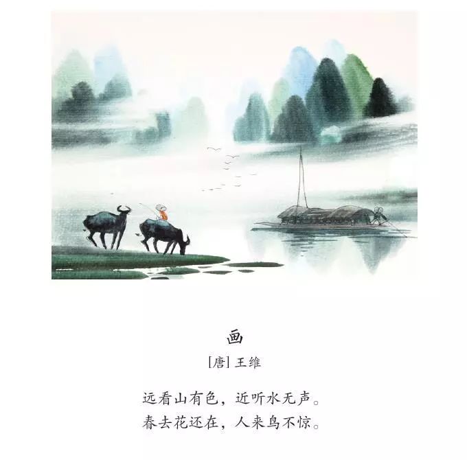 如果按照原詩的行文方式來翻譯,不容易體現出這首詩的頗有雅趣的畫面感。因此這里選擇將每一句在畫里的內容,即山、水、花和鳥提做主語,然后再加以描寫,這樣不僅有畫面感,而且句式簡單整齊。