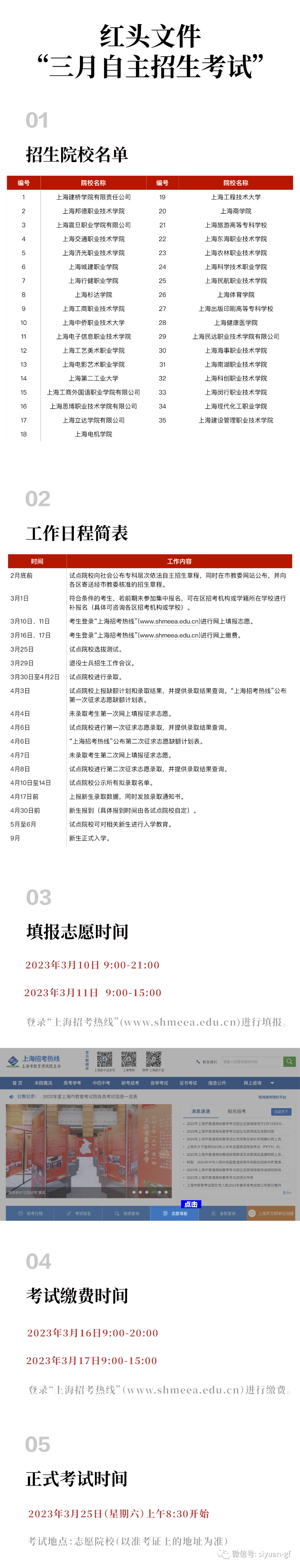2023年專科層次自主招生考試仍由統一文化素質測試和職業技能測試兩部分組成,其中,統一文化考試將于2023年3月25日舉行,2月底前各院校將陸續公布招生簡章,3月1日進行補報名,滿足條件考生將于3月10日通過上海招考熱線網站進行志愿填報。2023年,有35所高校參與專科層次依法自主招生考試招生,與去年相較增加4所!