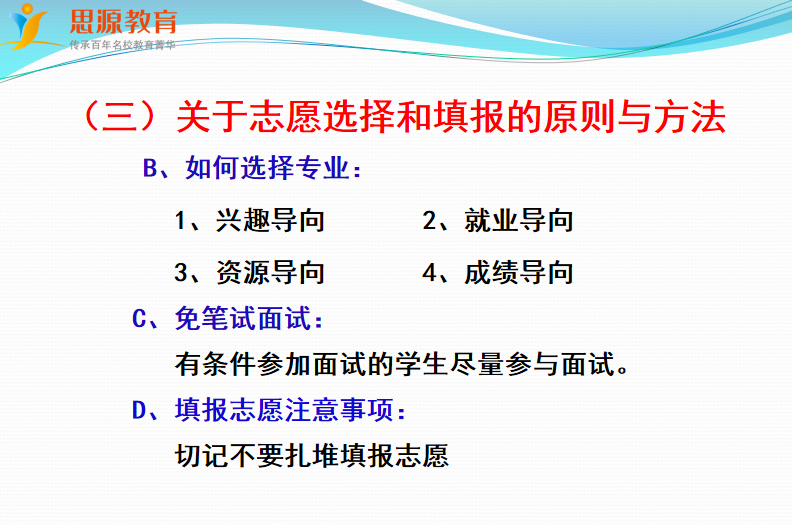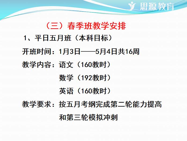 會議上,黃老師首先對思源教育三校生高復這幾年的成績向家長做了簡單的匯報。好的成績離不開成熟科學的教學體系,思源三校生配備了三支專業的隊伍:負責課程設置、教材編寫的教研團隊;負責授課的專業教師隊伍;負責班級管理的全職班主任團隊,三位一體,全方面的給予學生最大的幫助。