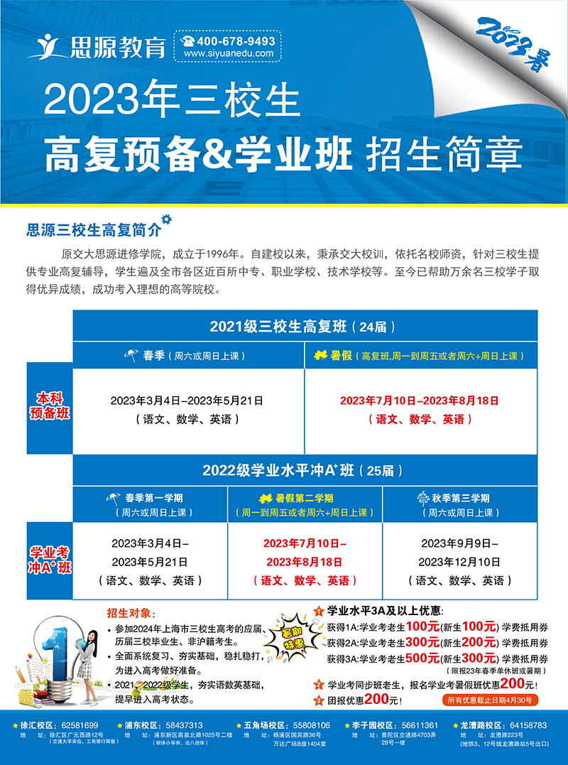 (詳情請(qǐng)點(diǎn)擊) 徐匯區(qū)龍漕路223號(hào)思源教育32035781/62581699 徐匯三校生高復(fù)校區(qū)