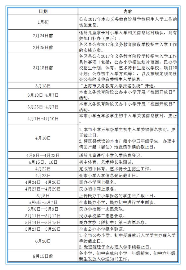 2017年,本市繼續(xù)實(shí)行小學(xué)一年級新生入學(xué)信息登記辦法。年滿6周歲(2010年9月1日~2011年8月31日出生)、本市戶籍的適齡兒童和符合條件的非本市戶籍的適齡兒童,均須先進(jìn)行入學(xué)信息登記。2月24日前,家長須對適齡兒童在讀幼兒園提供的相關(guān)人口信息、靈活就業(yè)信息進(jìn)行比對確認(rèn),如與實(shí)際情況不符,應(yīng)到有關(guān)部門補(bǔ)辦或更正信息;符合入學(xué)條件的非本市戶籍適齡兒童所持的《上海市臨時居住證》上的居住地址,還應(yīng)與父母所持居住證(或臨時居住證)上的居住地址相一致。4月8日~4月23日,在園適齡兒童家長在幼兒園登記孩子入學(xué)信息,獲取小學(xué)入學(xué)信息登記表;未入園適齡兒童家長在各區(qū)縣指定地點(diǎn)登記孩子入學(xué)信息,獲取小學(xué)入學(xué)信息登記表。5月27日~5月28日為全市公辦小學(xué)報名驗(yàn)證日,各區(qū)指定的報名驗(yàn)證點(diǎn)對已填寫入學(xué)信息登記的適齡兒童以及家長的證件進(jìn)行現(xiàn)場核對。