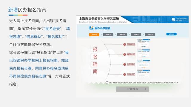 進(jìn)入網(wǎng)上報名頁面,會出現(xiàn)“報名指南”,提示家長要通過“報名登錄”“填報志愿”“信息確認(rèn)”“報名成功”四個環(huán)節(jié)方能確保報名成功。家長須仔細(xì)閱讀“報名指南”并點(diǎn)擊“我已閱讀民辦學(xué)校網(wǎng)上報名指南,知曉民辦報名步驟,同意民辦報名成功后不再修改民辦報名志愿”后,方可正式報名。