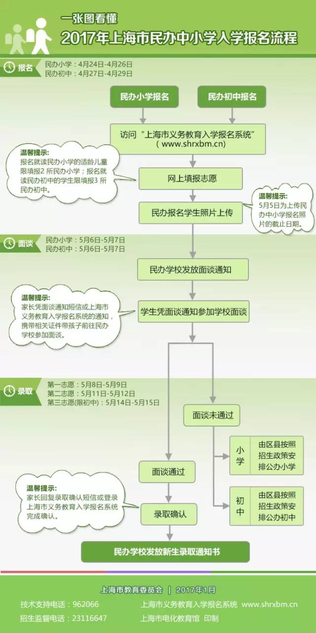 今年本市義務(wù)教育階段民辦學(xué)校招生依然堅(jiān)持“三統(tǒng)一、兩限定、兩公開、三承諾”(統(tǒng)一網(wǎng)上報名時間、統(tǒng)一面談時間、統(tǒng)一按志愿分批次錄取時間;嚴(yán)禁民辦中小學(xué)計(jì)劃外招生,無住宿條件的民辦中小學(xué)限定在本區(qū)縣內(nèi)招生,每個適齡兒童限報民辦小學(xué)2個志愿、民辦初中3個志愿;公開招生簡章、公開面談過程;在招生簡章中明示:不提前開展報名和面談工作、不收取各種特制的學(xué)生個人簡歷及各類獲獎證書、不與任何社會教育培訓(xùn)機(jī)構(gòu)掛鉤)。4月24日~26日,接受民辦小學(xué)網(wǎng)上報名;4月27日~29日,接受民辦初中網(wǎng)上報名,登錄“上海市義務(wù)教育入學(xué)報名系統(tǒng)”,點(diǎn)擊“民辦小學(xué)報名”或“民辦初中報名”進(jìn)行網(wǎng)上報名。家長在民辦學(xué)校網(wǎng)上報名成功后,須于5月5日前在“上海市義務(wù)教育入學(xué)報名系統(tǒng)”的“民辦報名學(xué)生照片上傳”欄目中按規(guī)定要求上傳學(xué)生本人照片(未上傳照片的不能參加面談)。全市民辦中小學(xué)統(tǒng)一的面談時間為5月6日~7日。5月8日起實(shí)施民辦學(xué)校按志愿分批次錄取。學(xué)生家長應(yīng)在規(guī)定的時間內(nèi),通過回復(fù)短信或登錄“上海市義務(wù)教育入學(xué)報名系統(tǒng)”及時完成確認(rèn)工作。