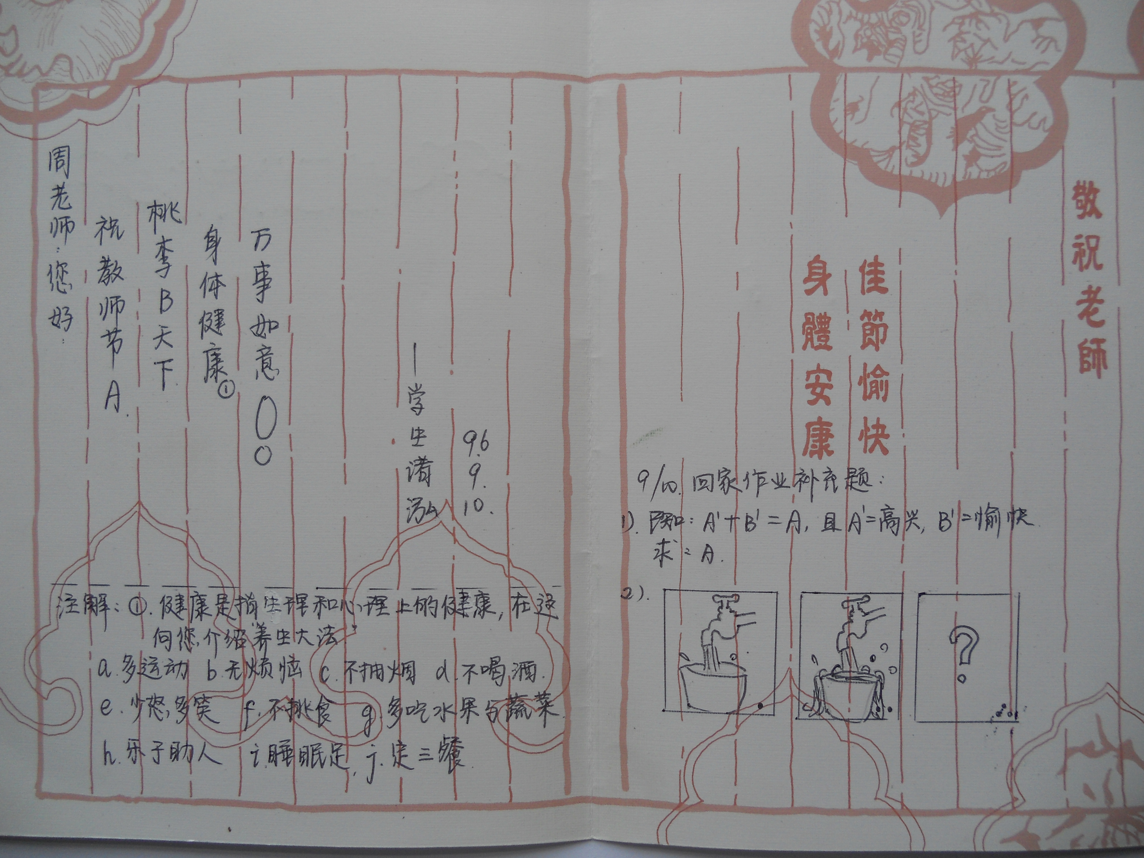 其四,1995年我調(diào)到位育中學任教,這一年的教師節(jié),有一位叫諸泓的學生自制了一張賀卡,我至今還珍藏著。這是一張她從小攤上用3角錢買來的教師節(jié)專用賀卡,右半頁印著三行豎排的紅字,“敬祝老師:佳節(jié)快樂、身體安康”。小諸同學在左半頁上方豎著寫了五行字,分別是“周老師你好”“祝教師節(jié)A”“ 桃李B天下”“身體健康①”“萬事如意!”最后是署名及日期96.9.10在這四行字下面,對“健康”做了注解:健康是指生理和心理的健康。在這里向你介紹養(yǎng)生大法:a.多運動,b.無煩惱,c.不抽煙,d.不喝酒,e.少怒多笑,f.不挑食,g.多吃水果蔬菜,h.樂于助人,i.睡眠足,j.定三餐。