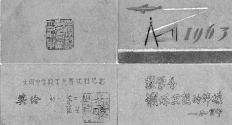 為了發(fā)掘數(shù)學尖子學生,學校從1963年開始每年舉辦一次數(shù)學競賽。競賽分年級進行,參加初賽的學生人數(shù)大約是該年級學生總數(shù)的30%左右,在初賽參加者中大概有三分之一的同學參加決賽。競賽試題按初一、初二、高一、高二年級學習內(nèi)容由各備課組提供初賽試題初稿,由姚善源老師定稿。我和鐘萬雍老師參與了初中組決賽的命題工作,高中組決賽命題由姚善源老師負責。我至今還保存那幾年大同中學數(shù)學競賽的卷子。現(xiàn)在看來,這些競賽題目貼近課堂教學內(nèi)容并不太難,但比較靈活,對參賽學生發(fā)揮了激發(fā)興趣、啟迪思維的作用。每次競賽結(jié)束后,學校都要舉行一次隆重的頒獎儀式。那個年代提倡精神獎勵,除了向獲獎?wù)哳C發(fā)獎狀以資鼓勵外,還給每位獲獎同學發(fā)了一張精美的賀卡,它是由徐冠欽老師設(shè)計并制作的。當時徐老師用了幾個晚上,一共制作了四十幾張。每一張賀卡上面蓋著由語文組吳爾昌老師的兒子(著名篆刻家陳巨來的關(guān)門弟子)篆刻的紅印章,上面寫著“大同中學數(shù)學競賽優(yōu)勝”。百年校慶我遇到66屆初三(5)班的藍蕓青和66屆高三(2) 班的張維銘時,藍蕓青告訴我,她曾在初一時參加數(shù)學競賽獲得第二名,至今還珍藏著這張賀卡和獎狀;張維銘告訴我,他也珍藏著當年他獲得的獎狀,并說獎狀上的字是總務(wù)處黃遜之先生書寫的。我真沒有想到經(jīng)過五六十年后,竟然還會有同學那么看重它、那么用心把它保存了下來,而且不止一個同學這樣做。現(xiàn)在將這張賀卡和獎狀翻拍成照片放到這里,和大家分享。