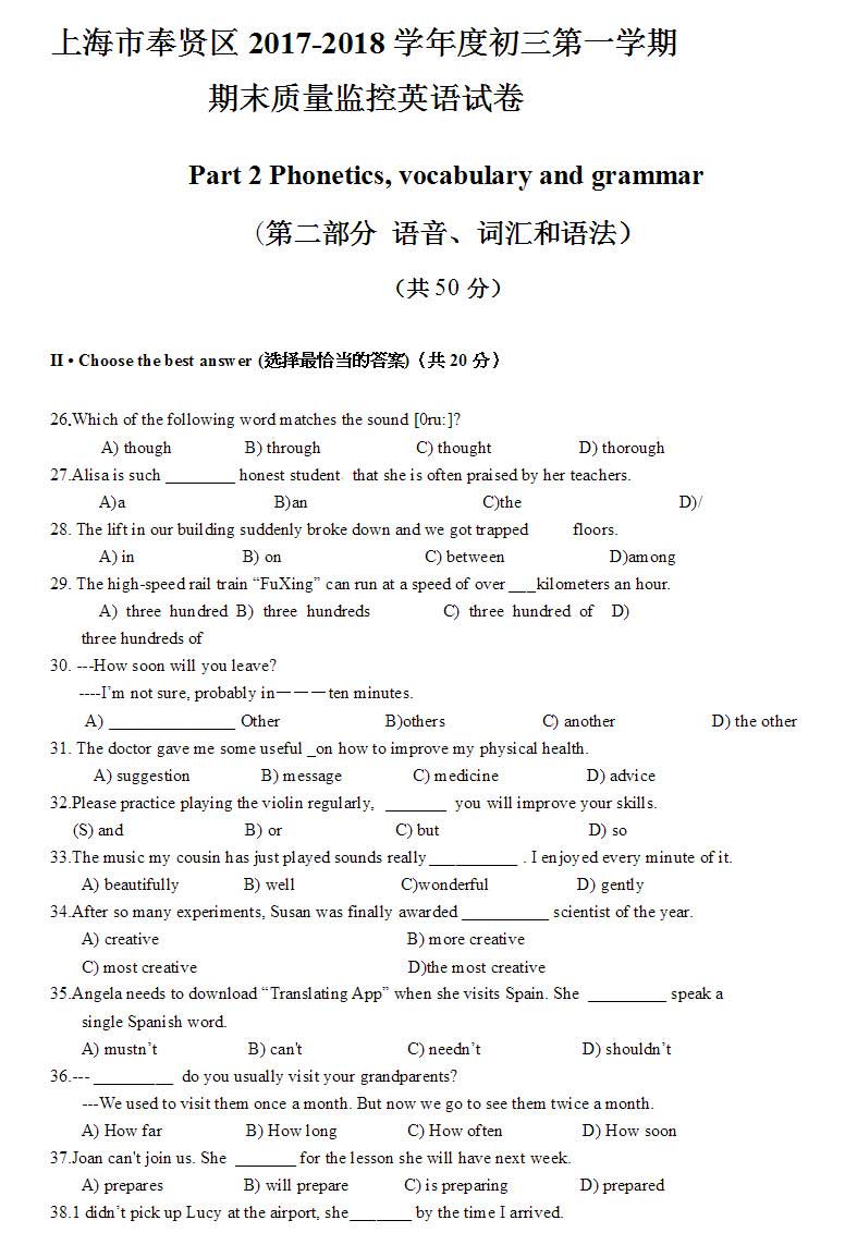 2018上海奉賢區一??奸_考,思源教育小編第一時間整理了英語考卷的真題和答案解析,分享給大家。其他區的同學們可以參考奉賢區的考點和難度,做最后的沖刺復習。